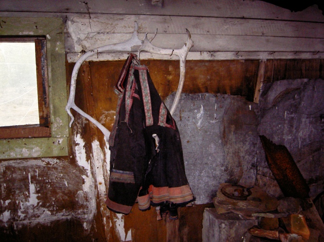 Romahtaneen rakennuksen sisällä lyhty ja kakaopurkki